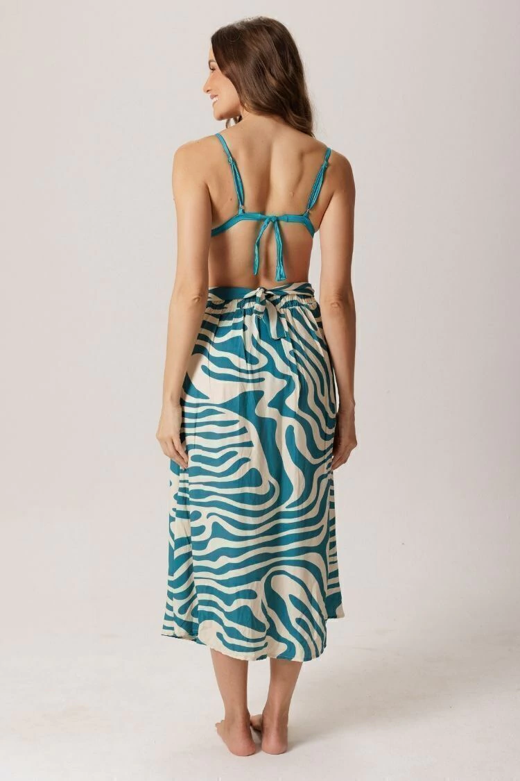 Confeccionada em viscose 100% leve, ela tem caimento fluido e fresco, ideal para os dias de sol. As estampas exclusivas da coleção refletem a beleza natural em movimento, inspiradas nas ondas e flores tropicais.